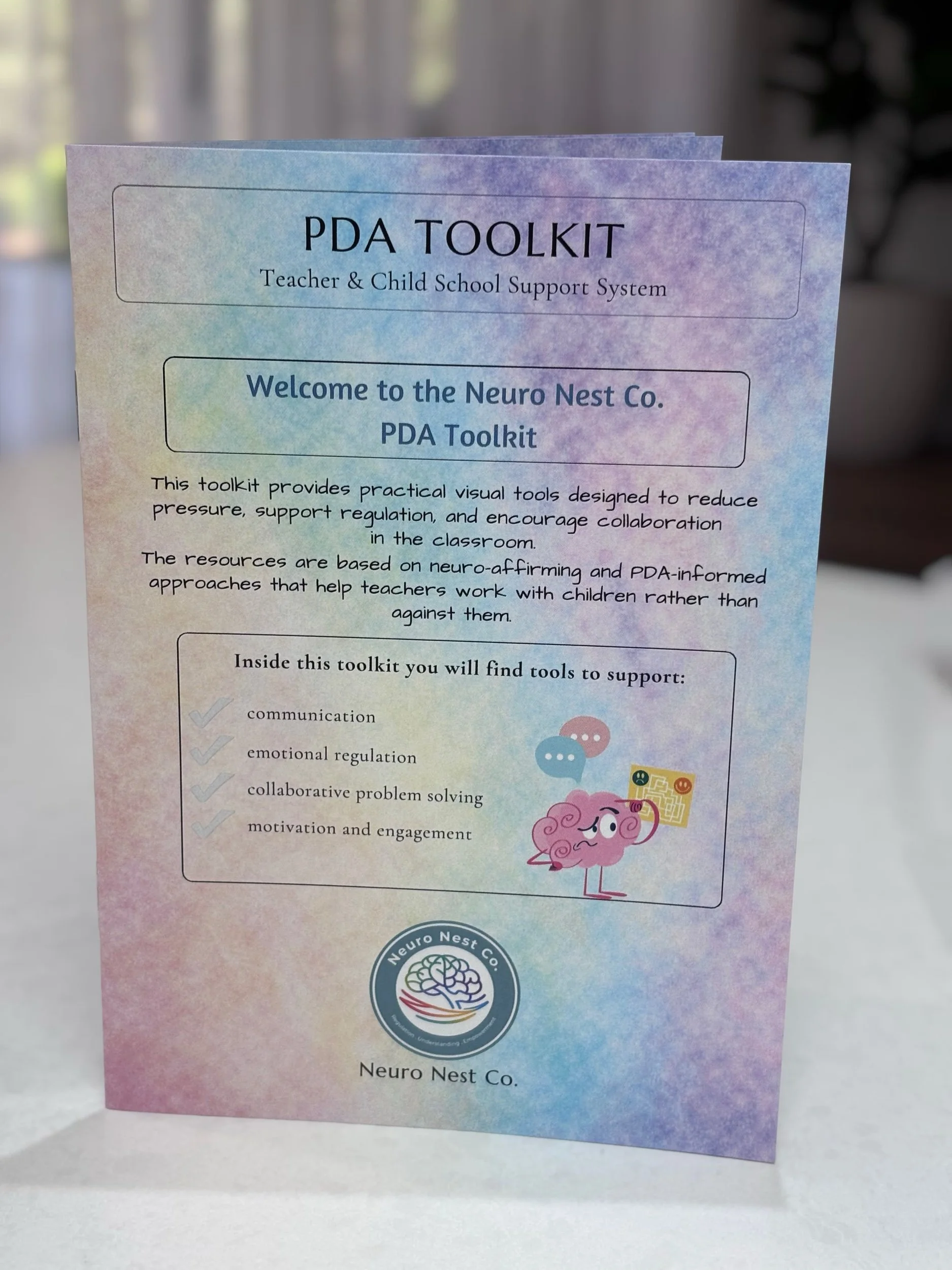 The Neuro Nest Co. PDA Classroom Toolkit is a practical, neuro-affirming support system designed to help teachers create calmer, more collaborative learning environments for students with Pathological Demand Avoidance (PDA) profiles.
