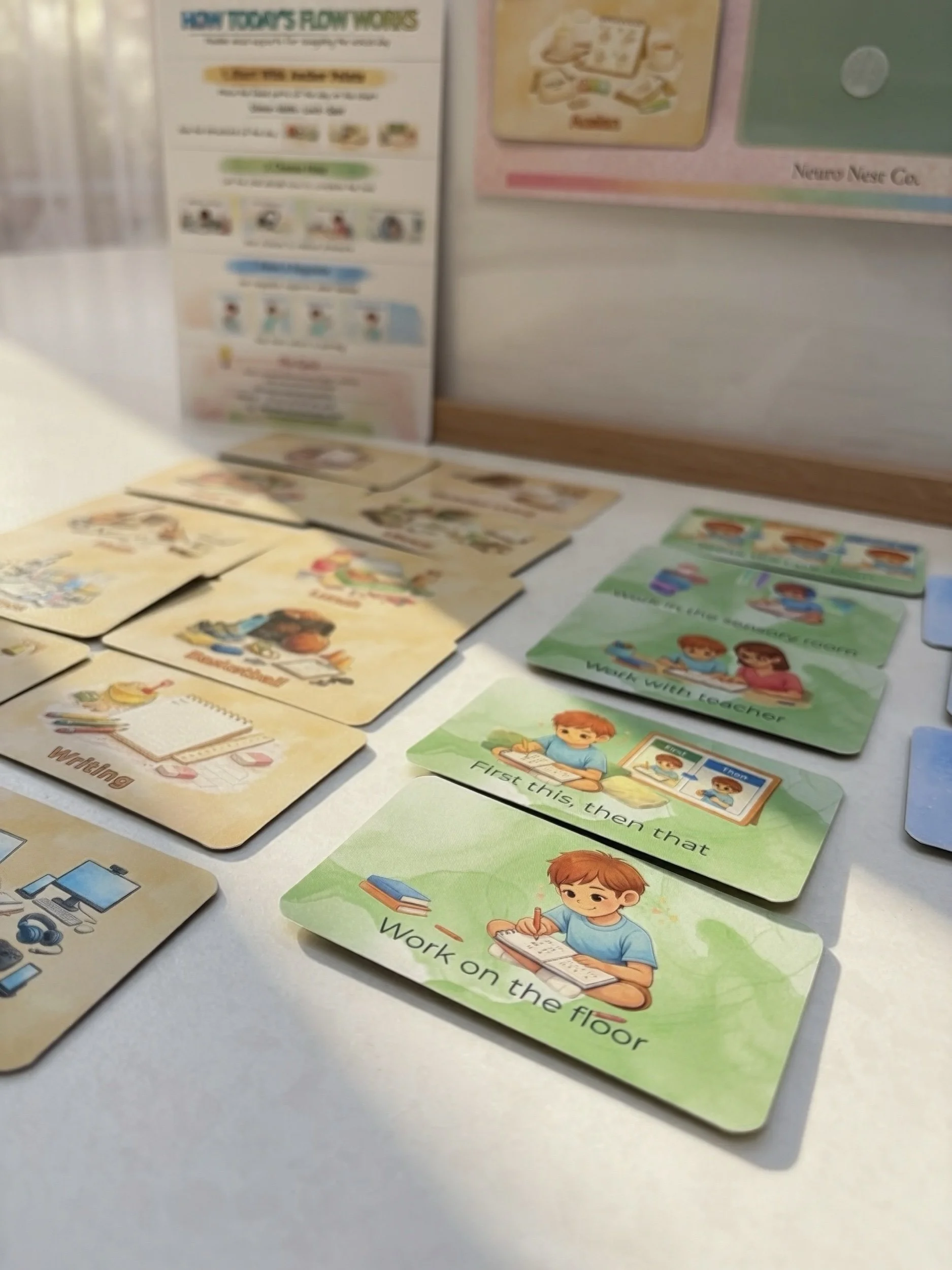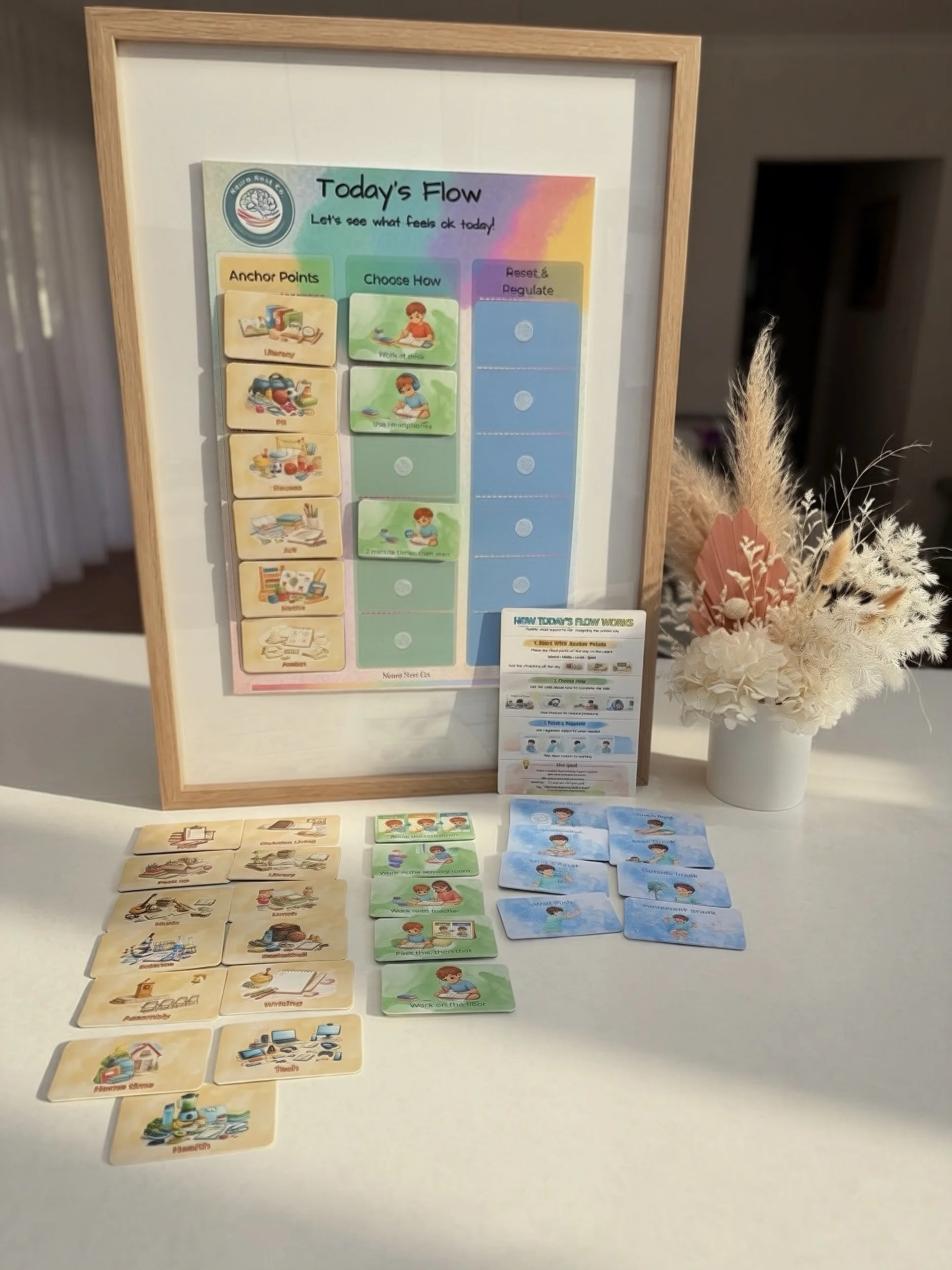 The Today’s Flow Chart & Cards is a visual support system designed to help children understand what’s happening, what’s coming next, and what they can expect throughout their day.